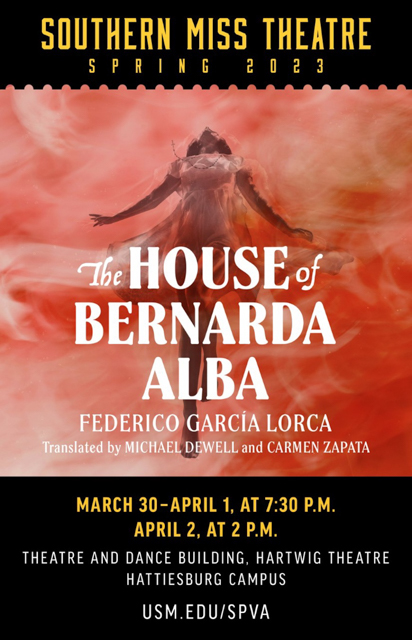 The University of Southern Mississippi (USM)’s Theatre program, housed in the School of Performing and Visual Arts, is proud to bring The House of Bernarda Alba to the Hartwig Theatre on the Hattiesburg campus on March 30 at 7:30 p.m. In-person tickets are now available for this event, and it is recommended for mature audiences.
